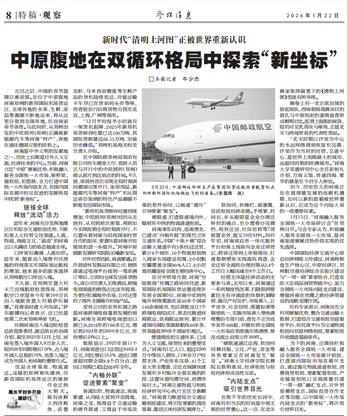 2026年1月22日,《参考消息》在“高水平对外开放调研行”专栏,发表新华社记者牛少杰采写的长篇综合报道《新时代“清明上河图”正被世界重新认识,中原腹地在双循环格局中探索“新坐标”》,全方位介绍河南省高水平对外开放取得的重大进展和突出成就。
